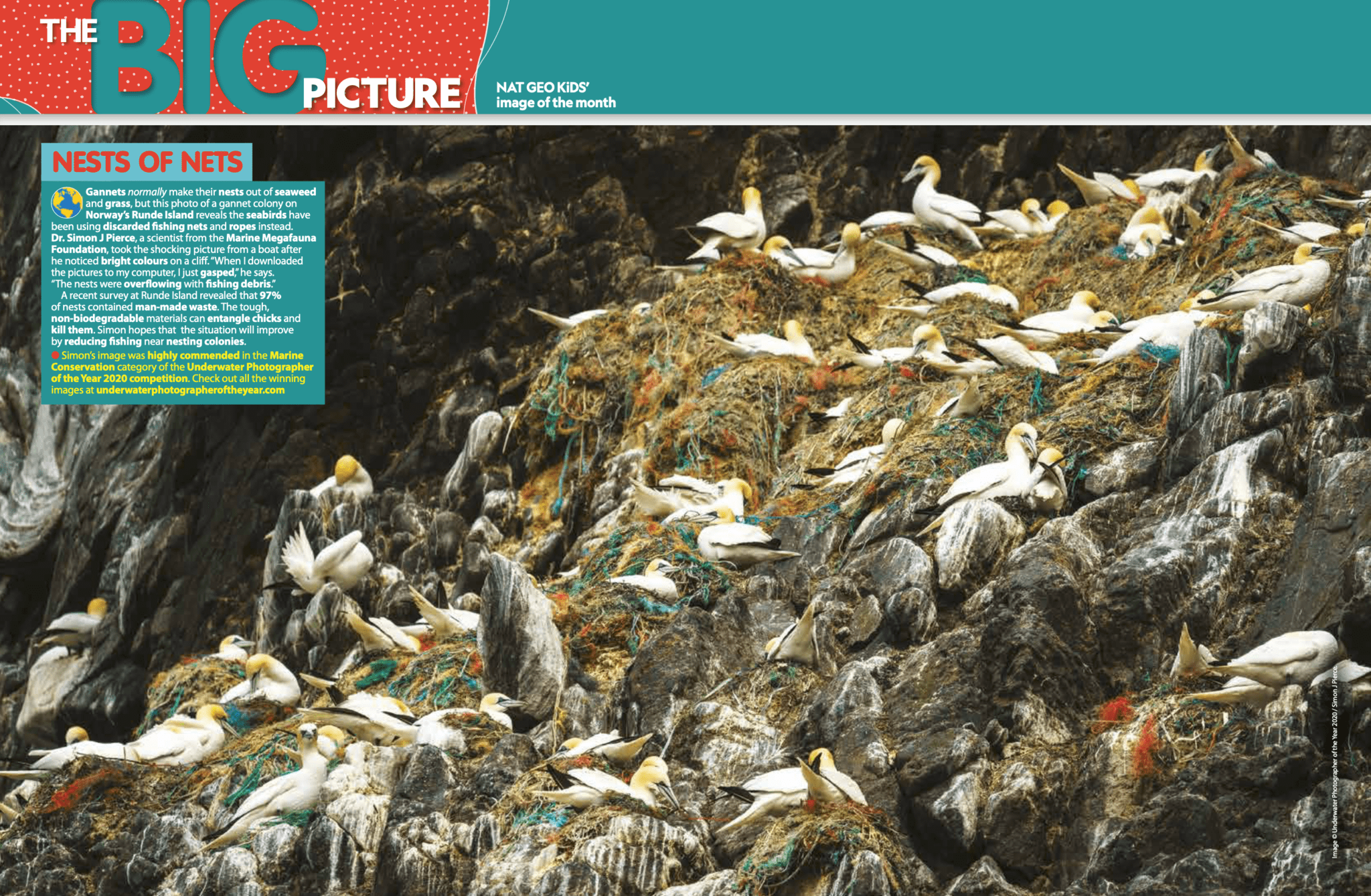 Gannets normally build their nests from seaweed and grass floating on the ocean’s surface. Increasingly, the seabirds are using discarded netting, ropes, and packaging straps from fisheries instead. This fishing waste seems to be becoming more common than the natural materials they instinctively gather. A recent survey at Runde Island found that 97% of their nests contained man-made debris3. Newborn chicks, and even adult gannets4, are routinely entangled and killed in these tough and non-biodegradable materials5.